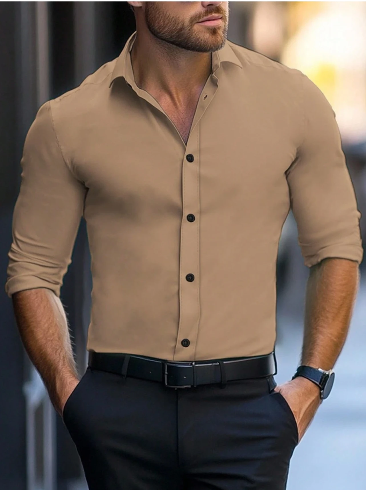 Manfinity Mode قميص رجالي أحادي اللون بأكمام طويلة وأزرار أمامية للاستخدام اليومي، مناسب للخريف
