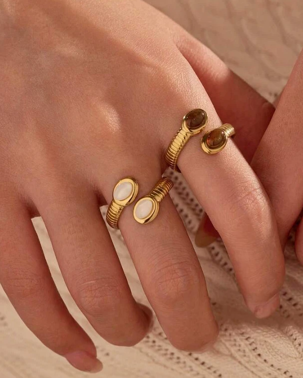 مجموعة من حلقتين أنيقتين مصنوعة من الفولاذ المقاوم للصدأ باللون الذهبي، مرصعتان بأحجار كريمة بيضاء وعين النمر