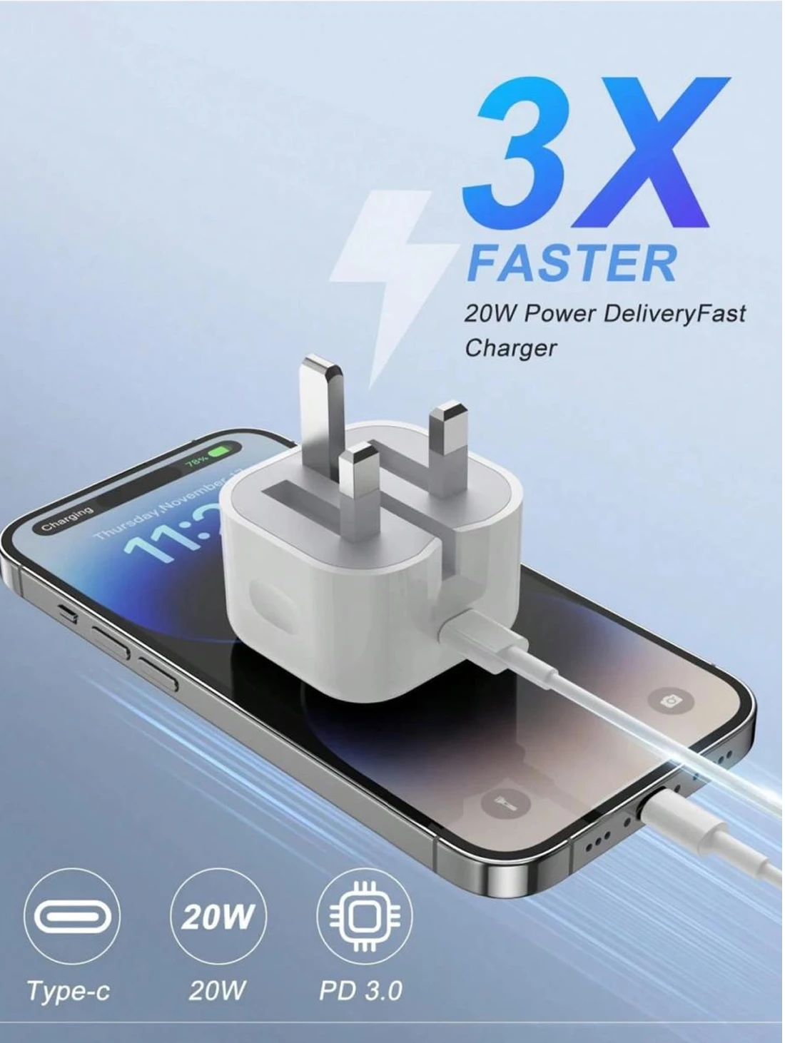 مجموعة محول 20 واط: محول شحن سريع 20 واط بقابس بريطاني + كابل بيانات شحن سريع 3.3 قدم/100 سم، متوافق مع 14 Pro Max/14 Pro/14 Plus/14/13/12/11، iPad، محول شاحن الحائط للهاتف