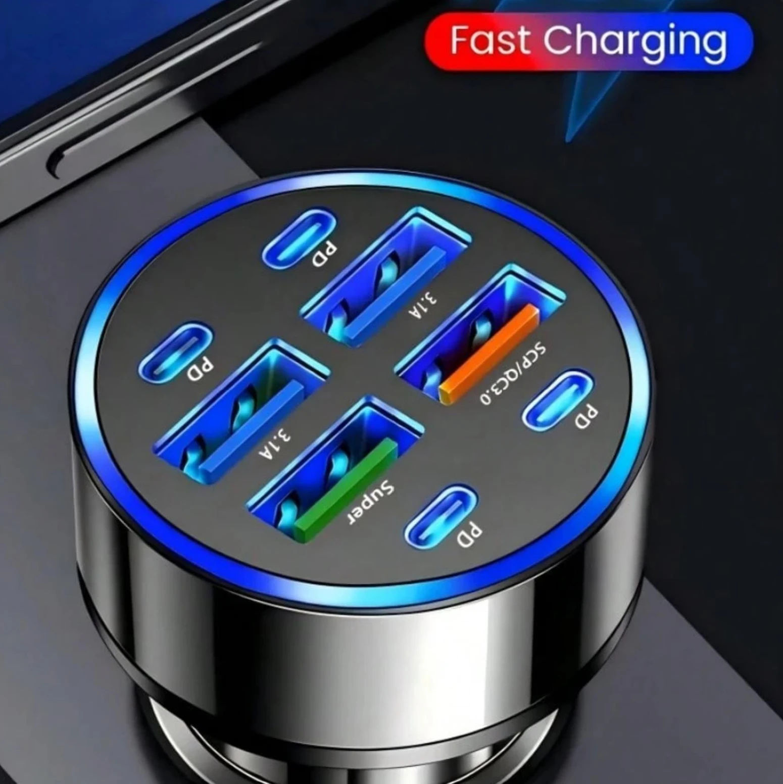 شاحن سيارة متعدد الوظائف 8 في 1 ب- 8 منافذ شحن سريع عالمي، 4 منافذ USB و 4 منافذ PD، متوافق مع أجهزة 17 Pro Max 14 Plus 13 12 11 وأجهزة وOnePlus، شاحن سريع مدمج وقابل للحمل، مؤشرات LED، إخراج مزدوج PD+USB، مثالي للاستخدام المنزلي والسيارة