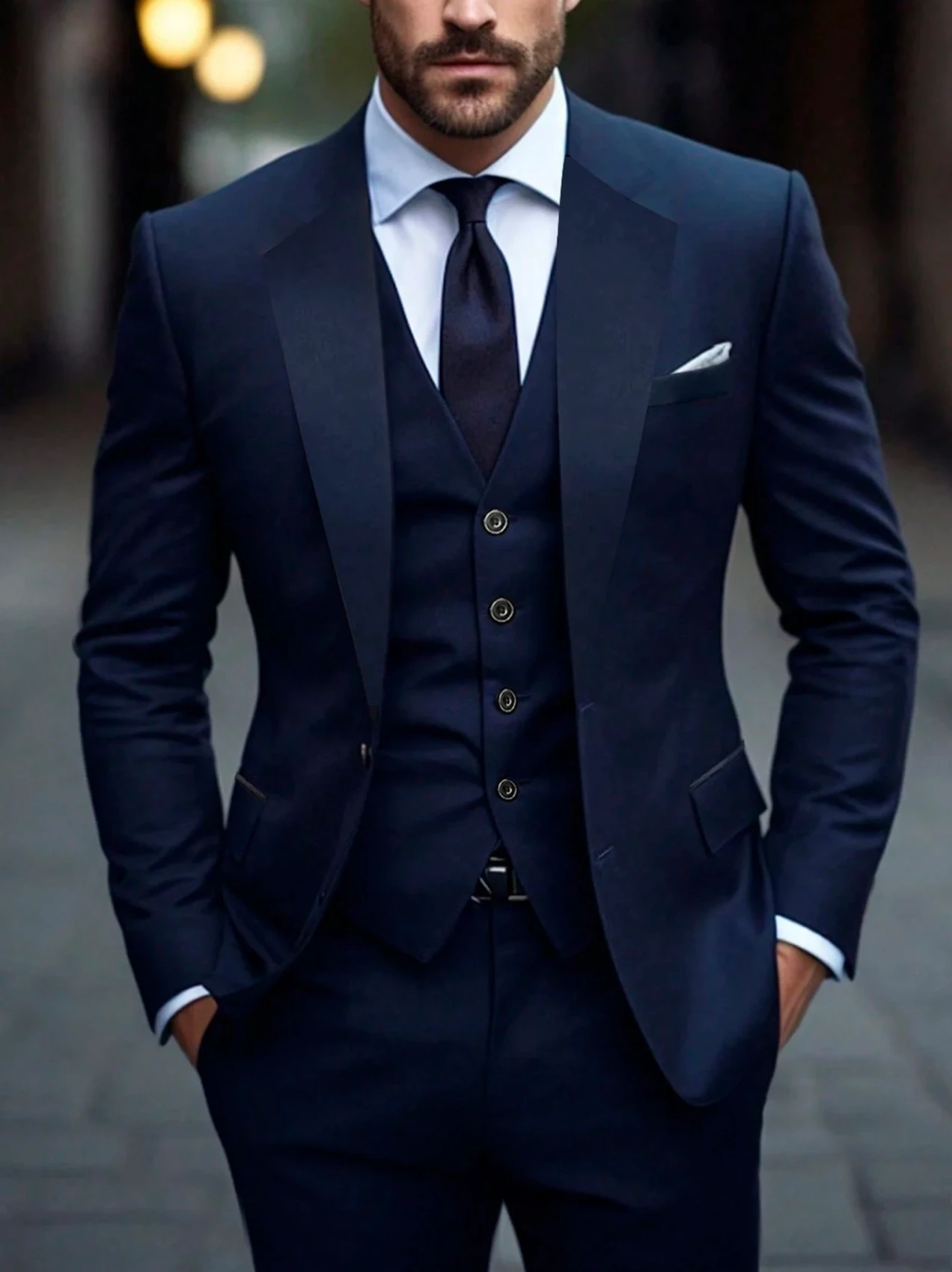 بدلة رجالية من 3 قطع، تتكون من: جاكيت بأكمام طويلة ذات لون أحادي، وبلوزة بدون أكمام مزودة بأزرار أمامية، وبنطلون