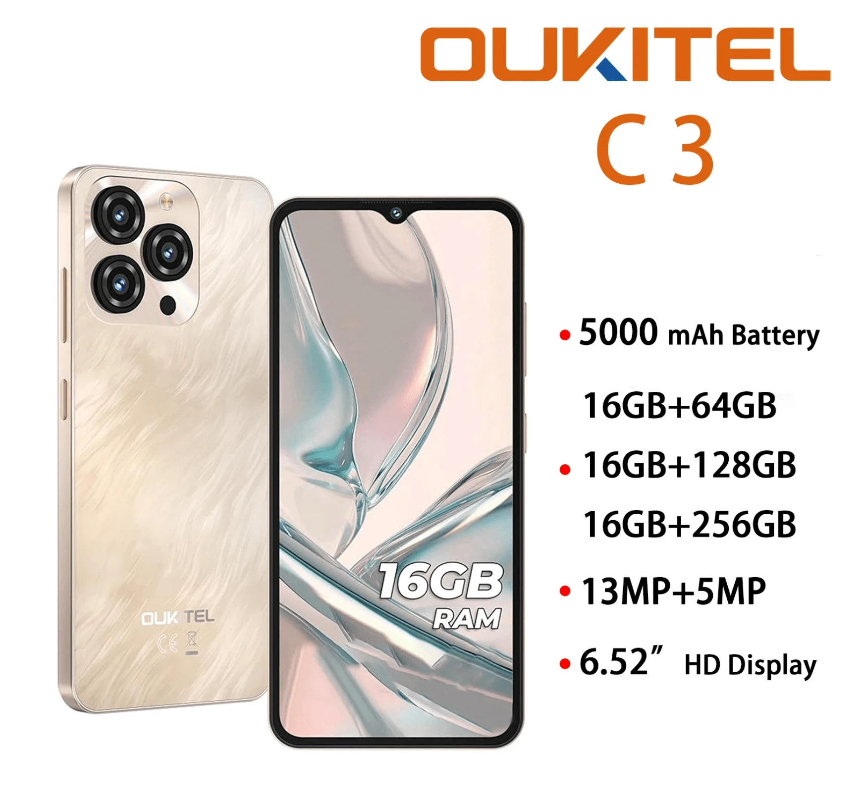 هاتف OUKITEL C3 أندرويد 14 مفتوح 2025-16 جيجابايت+(64 جيجابايت/128 جيجابايت/256 جيجابايت)، شاشة قطرة ماء 6.52 بوصة، بطارية 5000 مللي أمبير، كاميرا 13 ميجابكسل، معالج ثماني النواة، بصمة/جاك 3.5 مم/GPS
