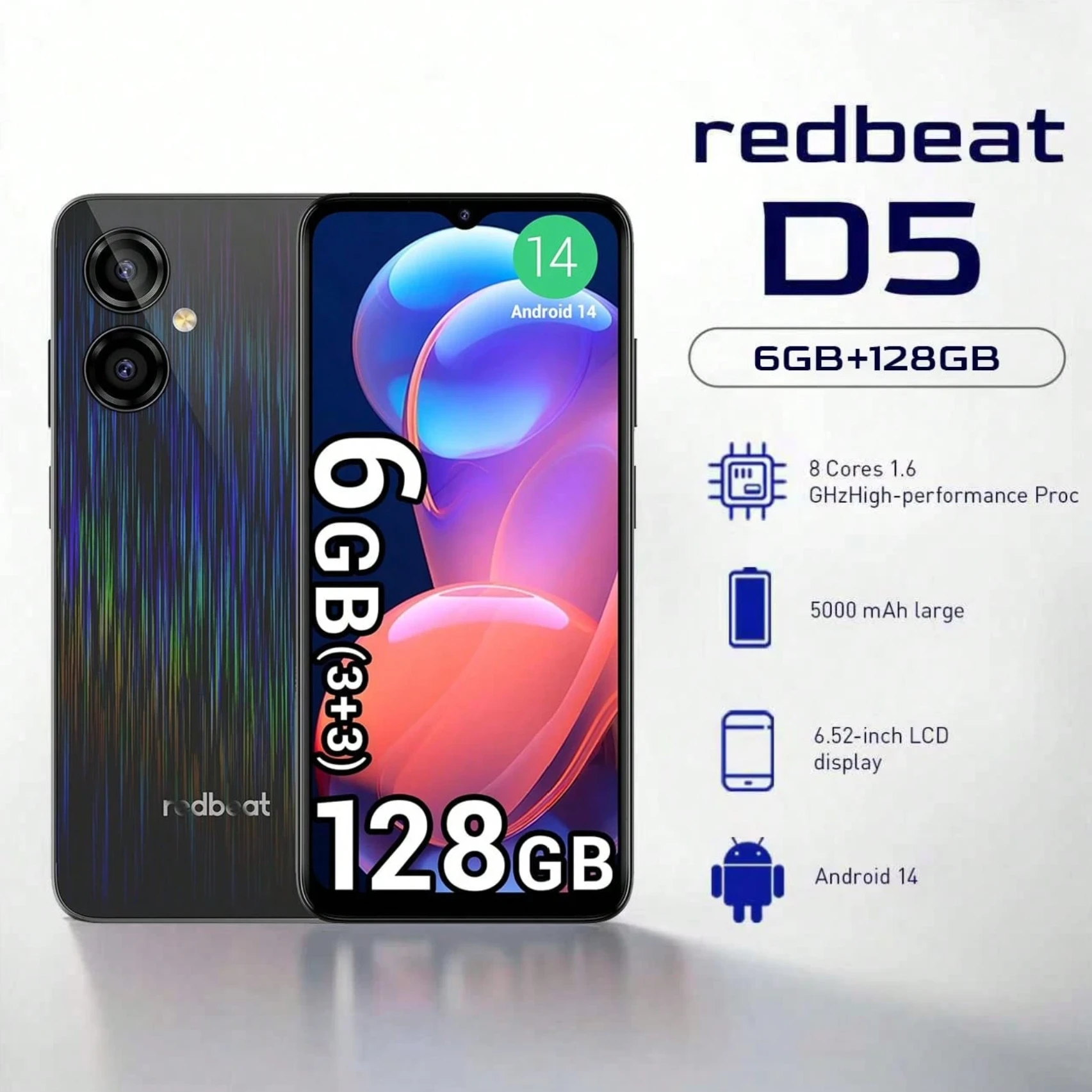 هاتف Redbeat D5 بذاكرة وصول عشوائي 6 جيجابايت (3 جيجابايت + 3 جيجابايت) وذاكرة تخزين 128 جيجابايت وكاميرا 13 ميجابكسل وشاشة HD+ بحجم 6.52 بوصة وبطارية 5000 مللي أمبير وبمعالج ثماني النواة بسرعة 1.6 جيجاهرتز. يأتي الجسم بتصميم خاص بتدرج اللون وواجهة USB-C (الشاحن غير مرفق). هدية مثالية لعائلتك أو أصدقائك في عيد الميلاد.