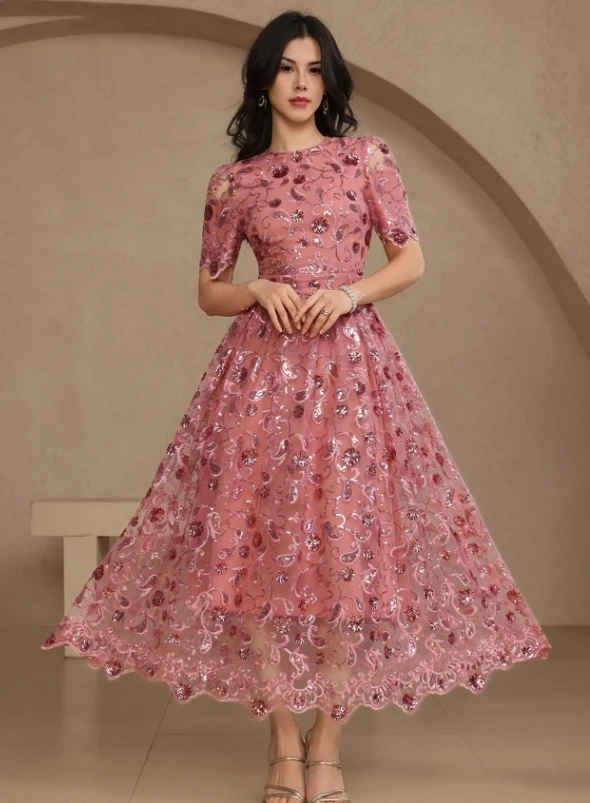فستان نسائي أنيق قصير الأكمام بأكمام شبكية مطرزة بالترتر
