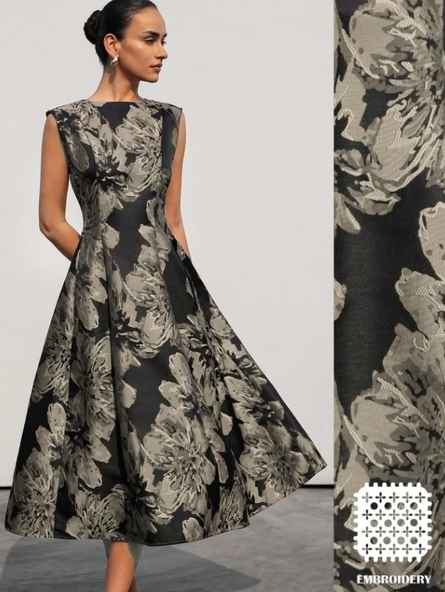 فستان أنيق للنساء بطول متوسط يتميز بأكمام منتفخة تضيف لمسة عصرية وأنثوية ناعمة، مع تطريز زهري راقٍ يعكس الذوق الرفيع ويمنح التصميم طابعًا فخمًا وجذابًا