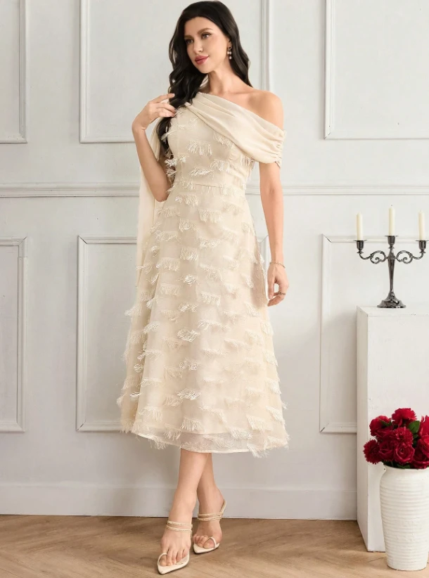 فستان أنيق منتصف الطول بتصميم عصري يتميز بأكتاف غير متناظرة