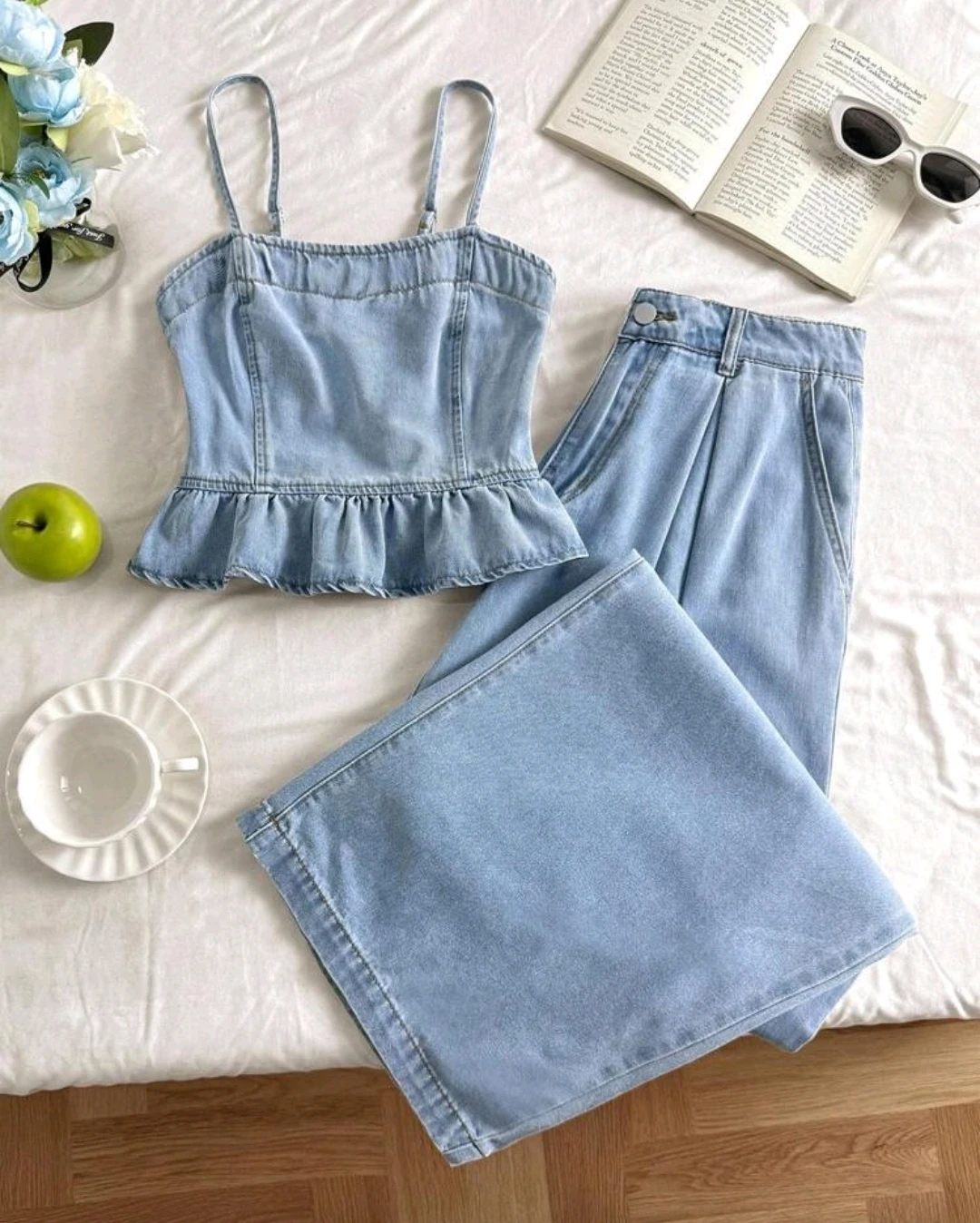طقم نسائي كاجوال مكوّن من بنطال واسع الساق مع كامي جينز أنيق