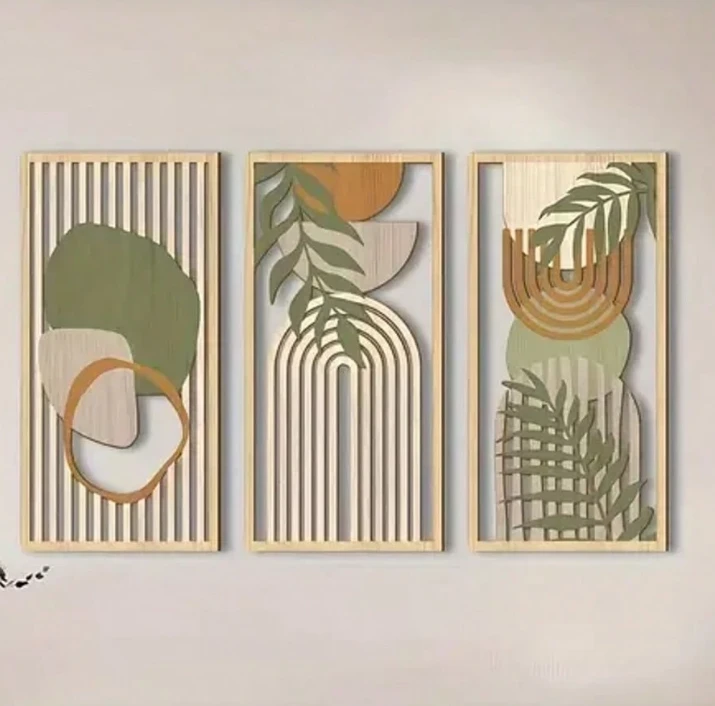 3 قطع من الفن الخشبي الجداري المجرد بلون الخضرة الحكيمة