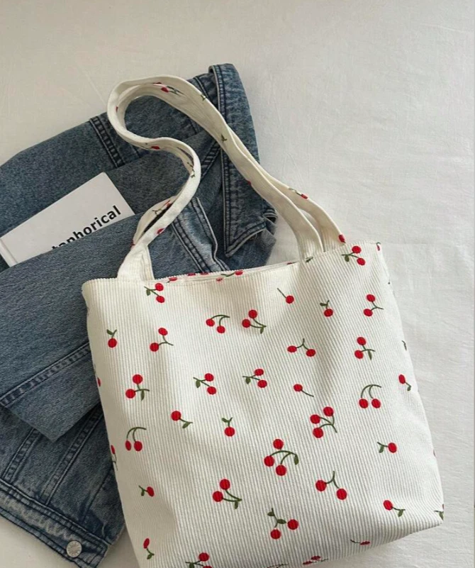 حقيبة كانفاس أنيقة بطبعة الفراولة، مصنوعة من قماش كوردروي ناعم ومزينة بتعليقات كرز جذابة تضيف لمسة عصرية ومرحة.
