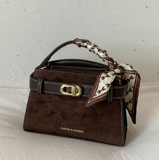 حقيبة يد مربعة للنساء بتصميم أنيق وراقي، مزينة بإبزيم متناسق مع وشاح أنيق يضيف لمسة فريدة.