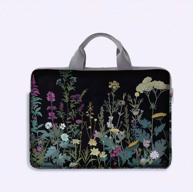 حقيبة كمبيوتر محمول مزخرفة بنقوش زهرية أنيقة، تجمع بين الجمال والعملية.