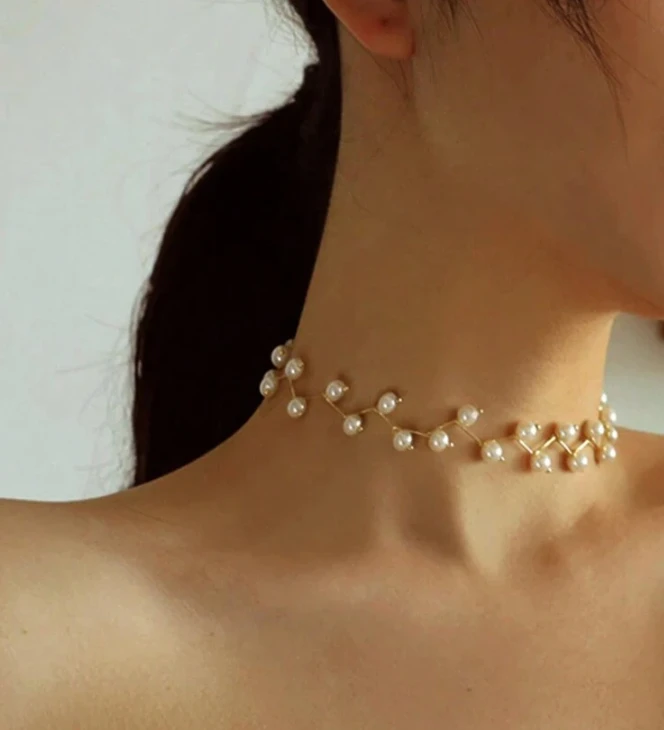 قلادة قصيرة معدنية على شكل غصن مزينة بخرز لؤلؤي اصطناعي عشوائي