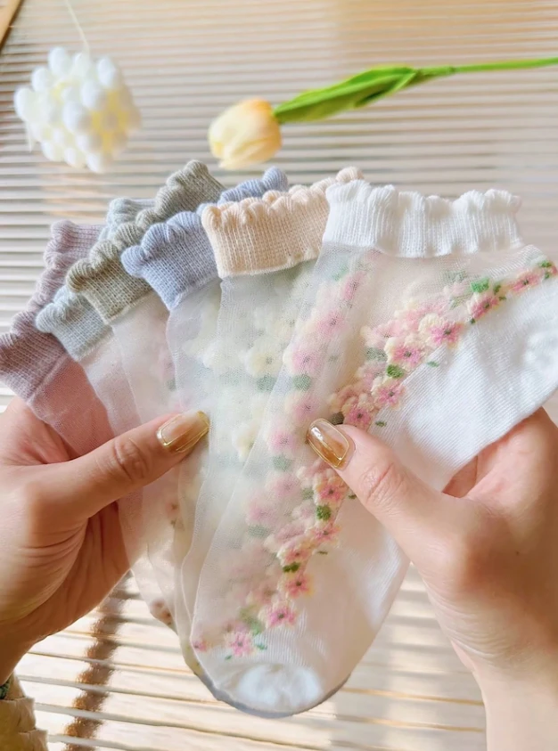 5 أزواج جوارب نسائية شفافة بزخرفة زهرية – أبيض