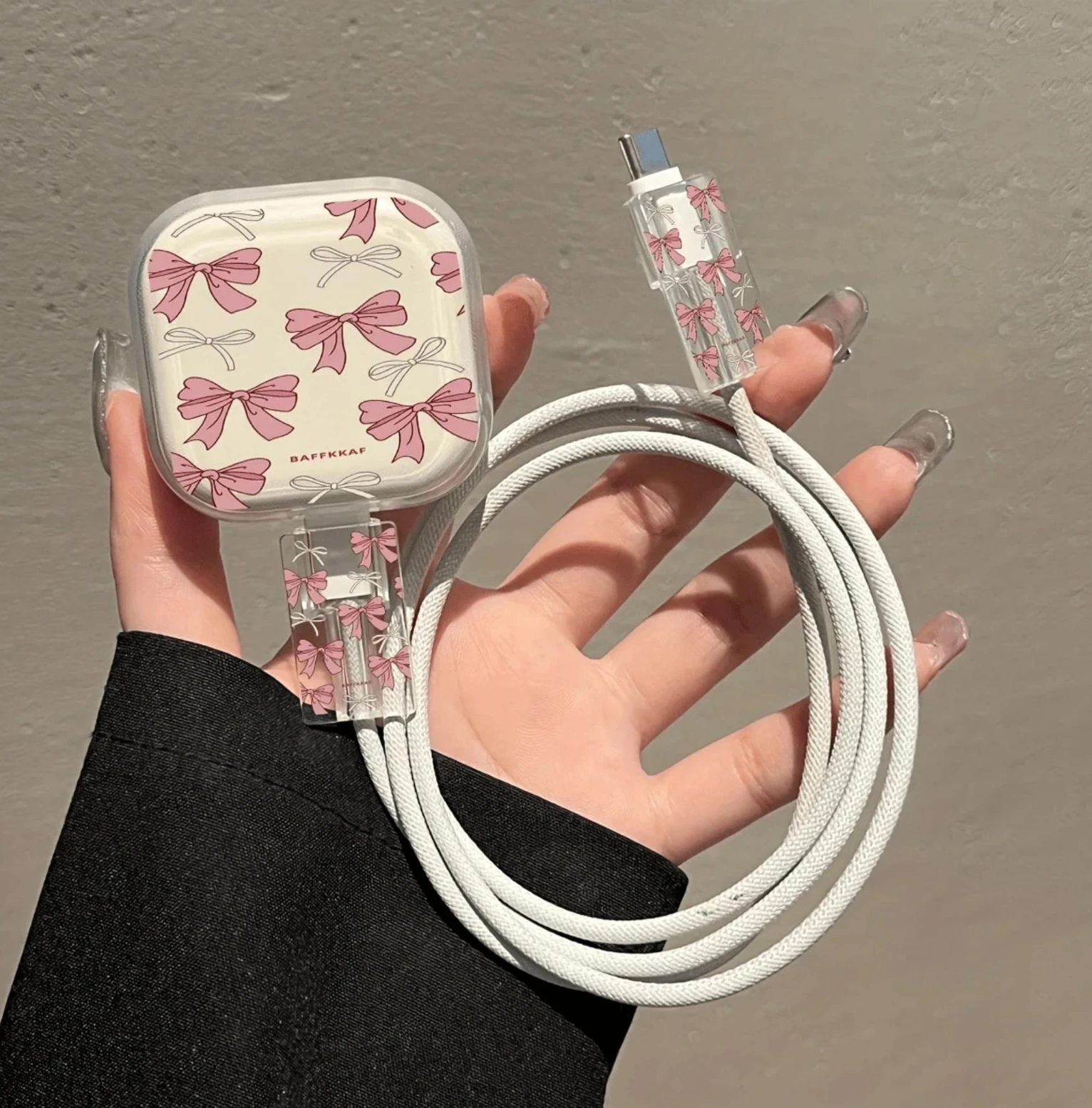مجموعة حافظة حماية شاحن بنمط وردي/قلب شفاف/زهري 3 قطع مناسبة ل- IP 18W/20W - تتضمن كابل البيانات وحبل حماية الطاقة، خيار هدية مثالي