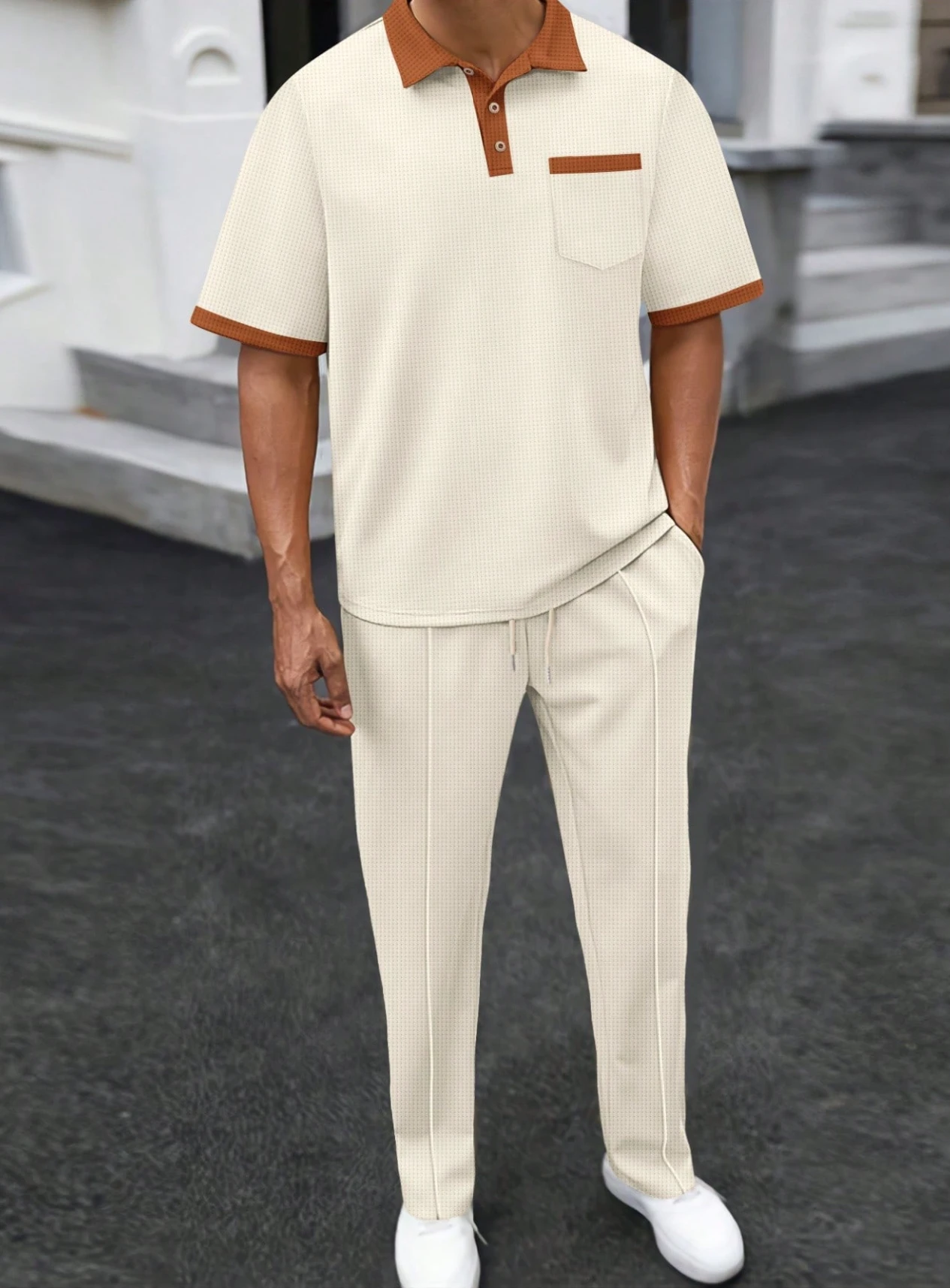 بدلة رياضية للرجال 2 قطعة ، قميص بولو قصير الأكمام كاجوال + بنطال طويل ، طقم رياضي بتصميم لحمية عصري