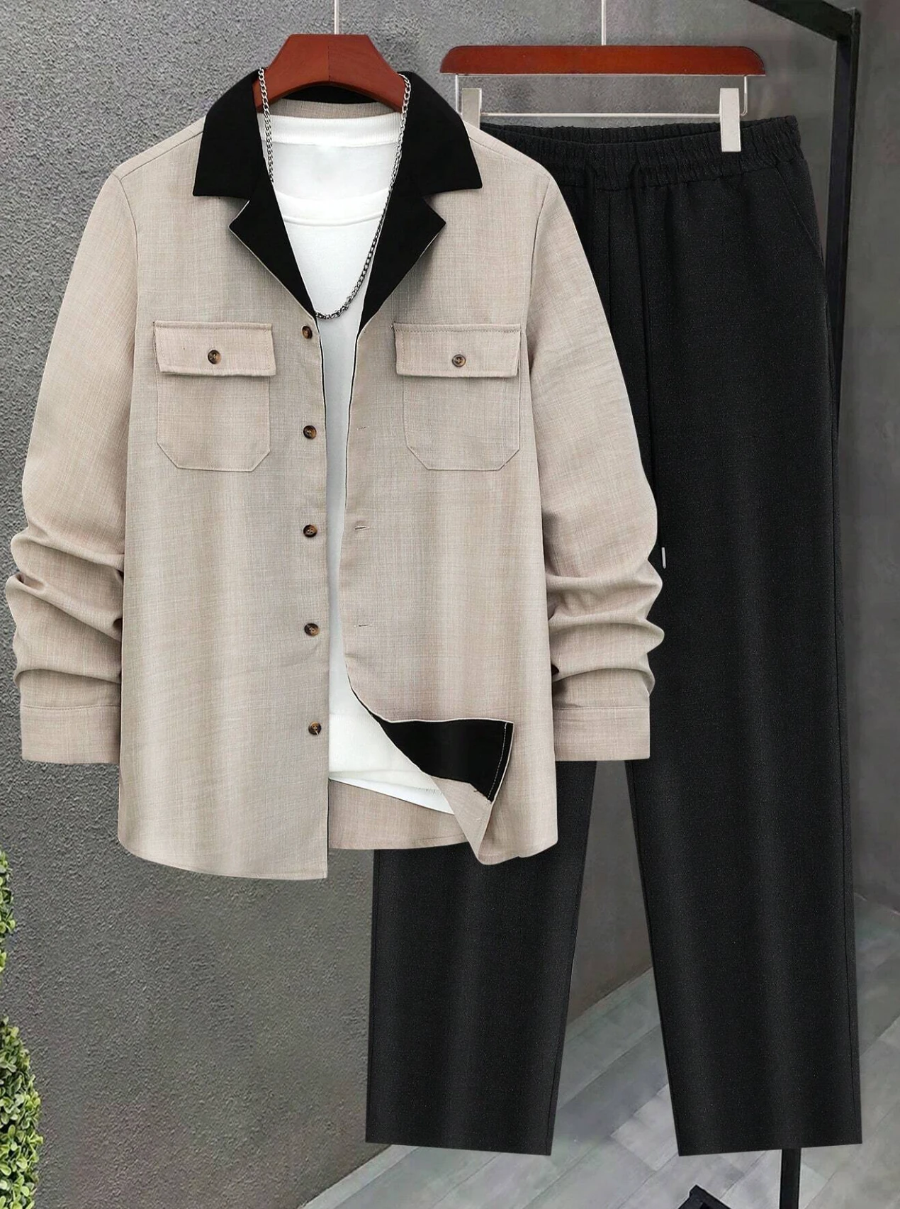 بدلة رجالية من قطعتين رقيقة للخريف، قميص بياقة وجيبين مزين بتريم متباين أحادي الصدر، أكمام طويلة وبنطال لون سادة بسحاب، بدلة كاجوال عادية