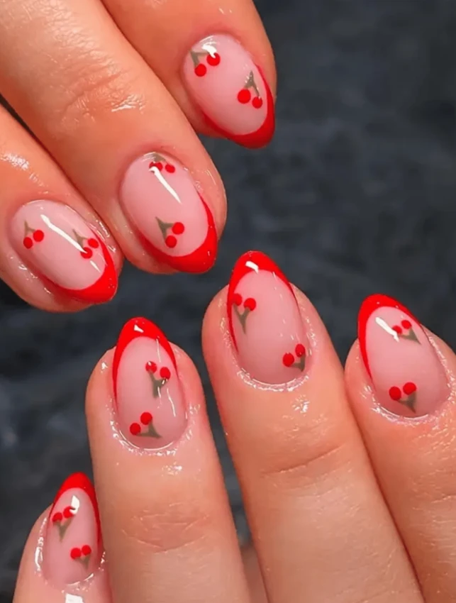 أظافر صناعية جميلة بتصميم الزهور والفراولة، أظافر فرنسية بطرف أبيض، أظافر صناعية كاملة بلون أحمر لامع، 24 قطعة من لوازم الأظافر للنساء والفتيات للاستخدام في الأعياد الصيفية