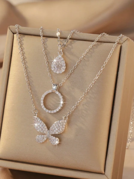 3 قلادات من النحاس والكريستال الزركوني بتصميم أنيق بشكل قطرة ماء وفراشة ودائري، قلادة للرقبة متعددة الاستخدامات للسيدات بتصميم عالي الجودة، هدية زخرفية