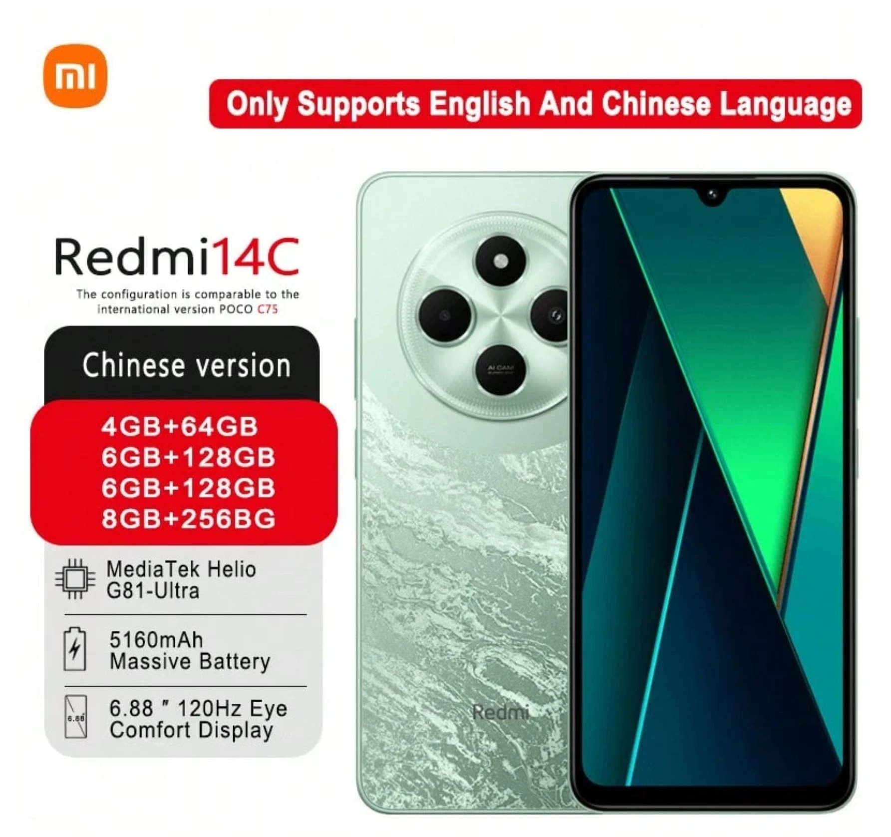 Xiaomi هاتف POCO C75 (الإصدار الصيني: Redmi 14C) الذكي: شاشة كبيرة جدًا بقياس 6.88 بوصة تراعي العناية بالعين، بطارية طويلة الأمد سعة 5160 مللي أمبير، سماعات قوية، معدل تحديث 120 هرتز، مقاوم للخدش وقوي. مثالي للمسنين - استخدام خالٍ من المخاوف، يدعم اللغتين الإنجليزية والصينية فقط.
