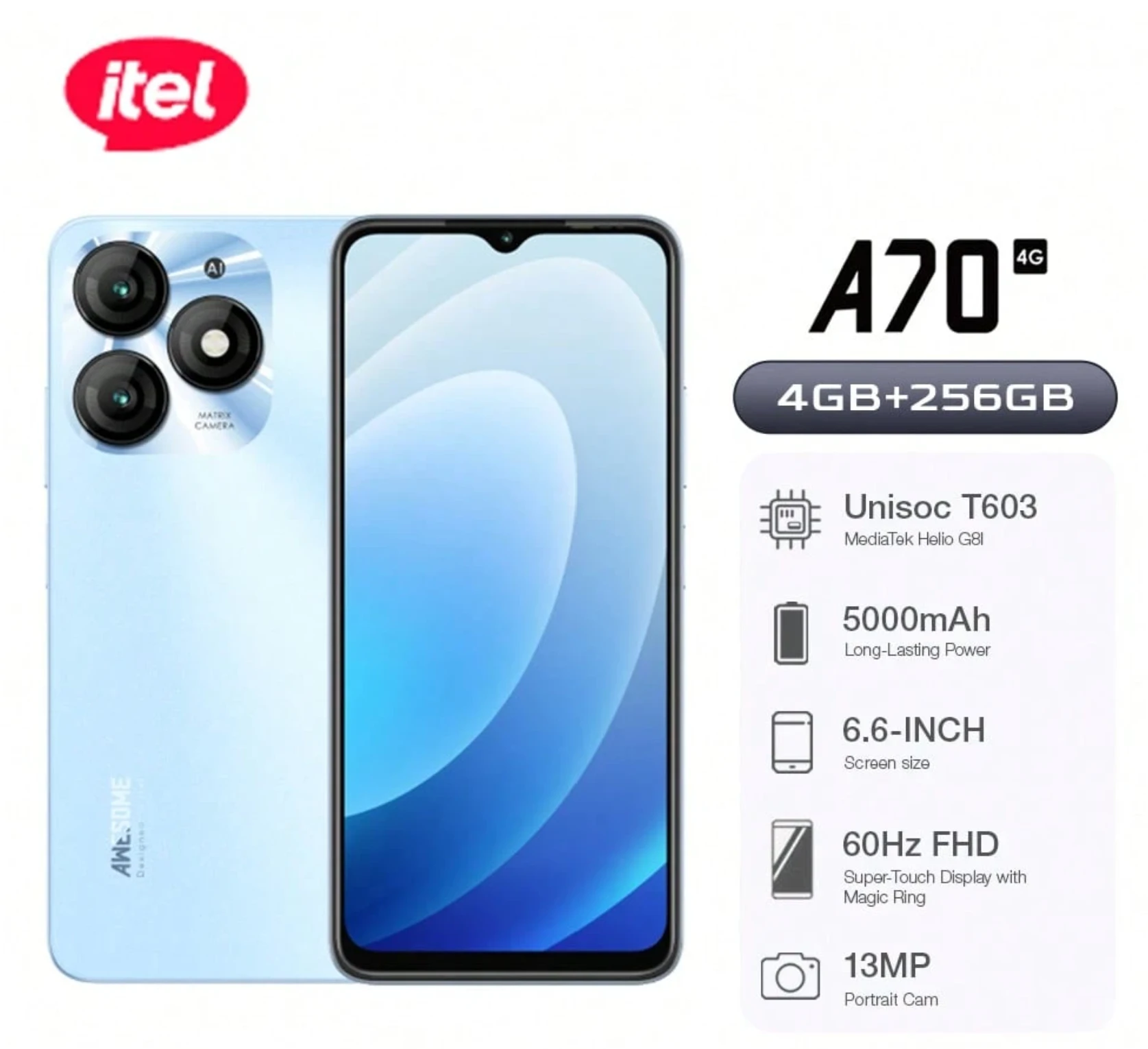 itel A70 256GB+4GB، شاشة 6.6 بوصة HD+ إطار سفلي فائق الضيق + بصمة جانبية + تصميم لوحة مركبة رائدة، بطارية 5000 مللي أمبير طويلة الأمد + شحن سريع 10 واط من نوع C