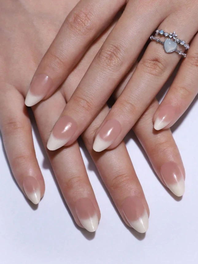 24 قطعة/مجموعة أظافر فرنسية قصيرة بشكل اللوز بألوان تدرجية من البيج والأبيض الحليبي، أظافر مضغوطة، مع قطعة واحدة من كتلة تلميع الأظافر وقطعة واحدة من جيل الجيلي
