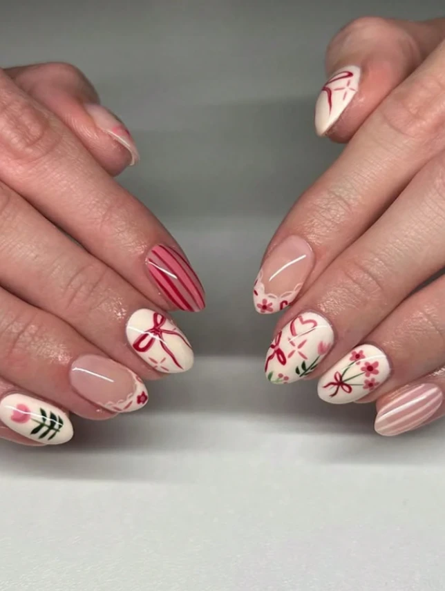 24 قطعة/مجموعة أظافر مستعارة قصيرة بشكل اللوز، مزينة بتصاميم الأزهار والخطوط والفيونكات، مناسبة للفتيات والنساء للاستخدام اليومي وفي المناسبات الربيعية/الصيفية وحفلات الأعياد، مستلزمات الأظافر