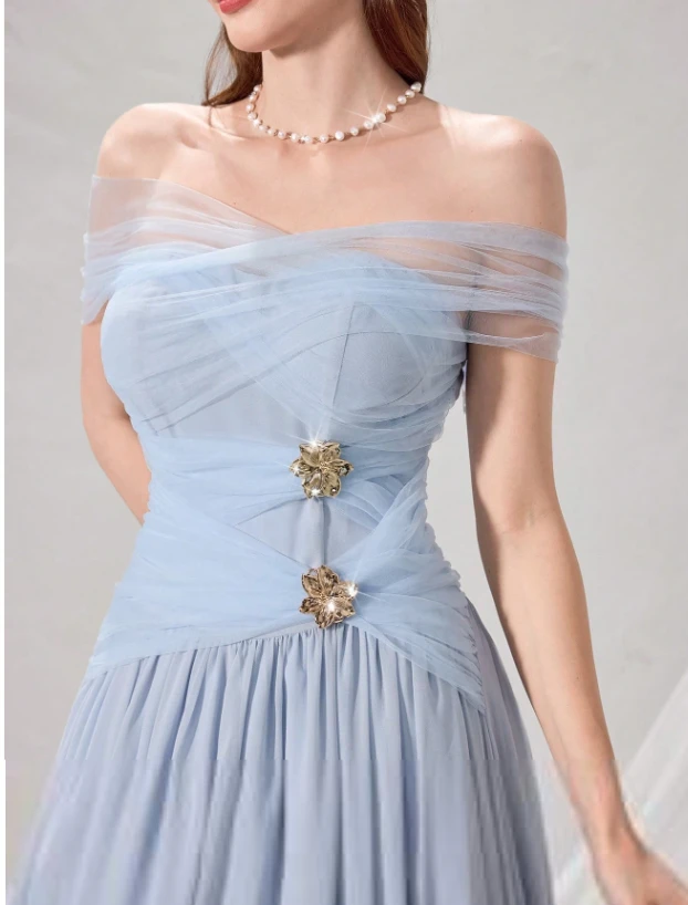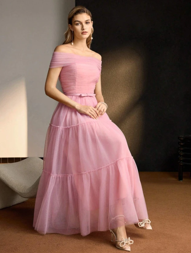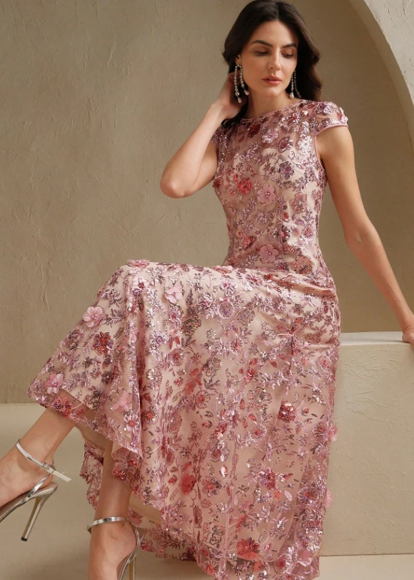 فستان سهرة نسائي رسمي من قماش الشبك بتصميم أنيق وجذاب
