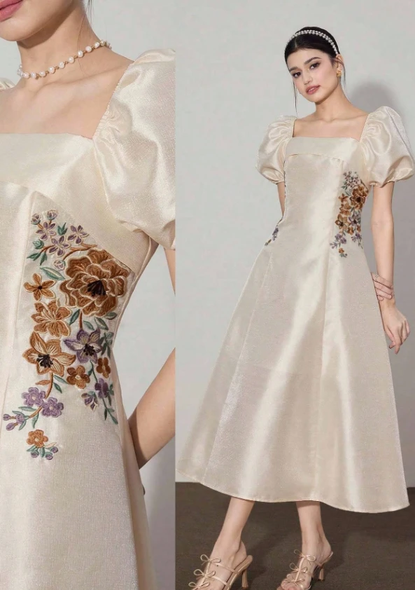 فستان أنيق للنساء بطول متوسط يتميز بأكمام منتفخة تضيف لمسة عصرية وأنثوية ناعمة، مع تطريز زهري راقٍ يعكس الذوق الرفيع ويمنح التصميم طابعًا فخمًا وجذابًا