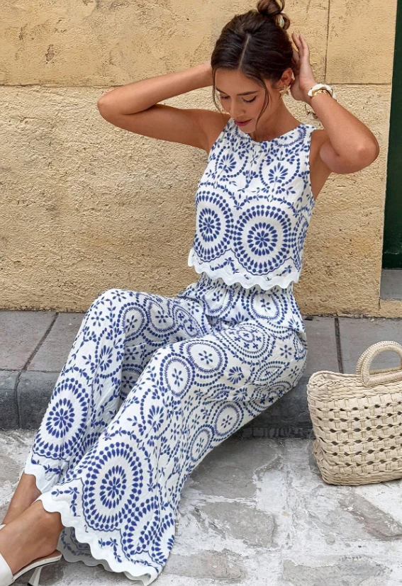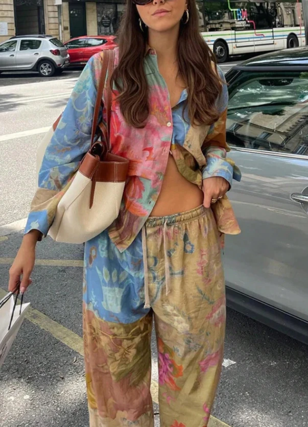 طقم نسائي بطابع بوهيمي كاجوال مزين بطبعة زهرية أنثوية