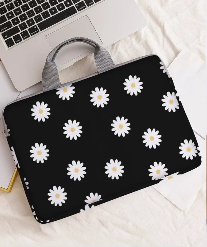 حقيبة لابتوب محمول بنمط زهور الأقحوان الأنيق، بتصميم قطعة واحدة يجمع بين البساطة والجمال.